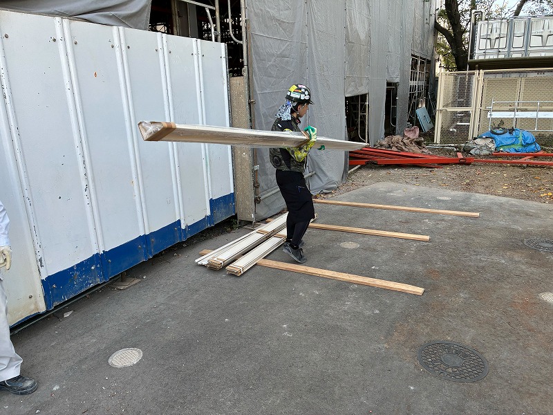 「玉掛け」とは、クレーンを使用して資材を吊り上げ、所定の場所に搬入する方法です。重量物や大型資材を一度に運ぶことができ、効率性と作業スピードに優れています。作業には「玉掛け技能講習」の資格が必要で、安全性を確保しながら正確に資材を吊り上げる技術が求められます。人力では困難な資材も、玉掛けを活用することでスムーズに搬入できるため、現場に欠かせない搬入方法です。TFcompanyでは有資格者が担当し、常に安全を最優先に作業を進めています。